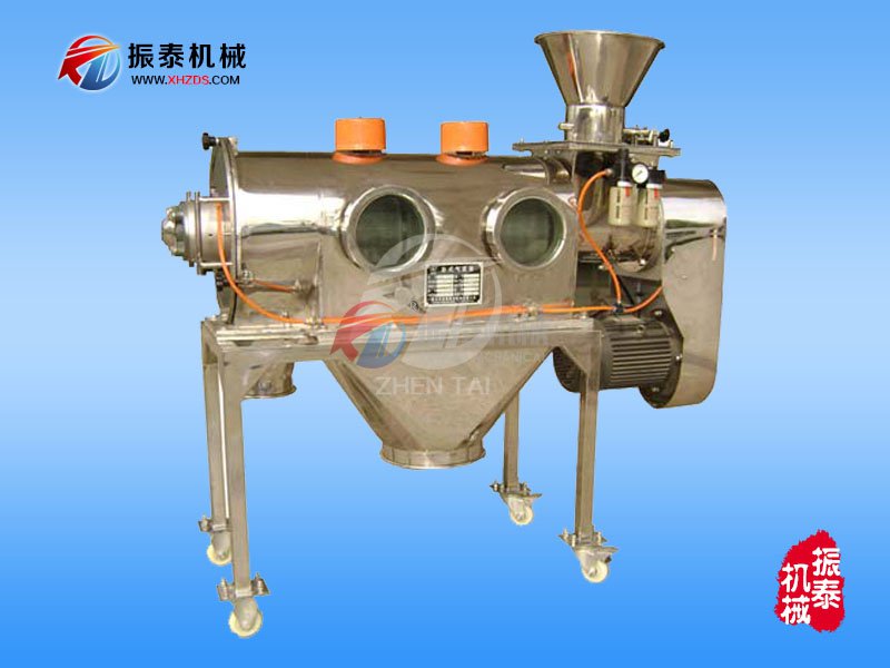 氣流篩的篩網(wǎng)呈圓筒狀,放置于氣流篩機(jī)體內(nèi),氣流篩擯棄了傳統(tǒng)的重力勢(shì)能作業(yè)原理,開辟了載流體動(dòng)能做功的篩理新途徑,所篩分物料通過(guò)螺旋輸送系統(tǒng)與氣流混合、物化后進(jìn)入網(wǎng)筒內(nèi),物料再通過(guò)網(wǎng)筒內(nèi)風(fēng)輪葉片時(shí)受到離心力和旋風(fēng)推進(jìn),從而能使物料噴射過(guò)網(wǎng),最后由細(xì)料排出口排出,而不能過(guò)網(wǎng)的物料沿網(wǎng)筒壁從粗料排出口排出。它是在密閉狀態(tài)下利用高速氣流做載體,使充分?jǐn)U散的粉料微粒以足夠大的動(dòng)能向篩網(wǎng)噴射,達(dá)到快速分級(jí)之目的。因此氣流篩的產(chǎn)量大、效率高、不粘網(wǎng)、不堵網(wǎng)孔、細(xì)度精確。